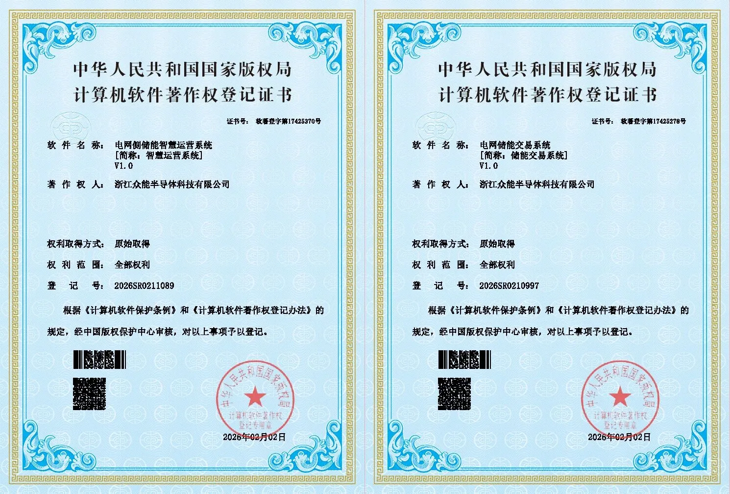 在电网侧储能项目加速落地的当下,高效运维与市场收益兑现仍是行业普遍面临的挑战。浙江众能半导体近日完成《电网侧储能智慧运营软件V1.0》与《电网侧储能市场化交易软件V1.0》的自主研发,相关成果已获国家计算机软件著作权登记,并在实际项目中完成初步验证。这一成果不仅标志着公司在能源数字化核心技术领域的持续突破,更意味着其为电网侧储能资产提供的智能化解决方案已形成完整闭环,具备可复制、可验证的商业落地能力。