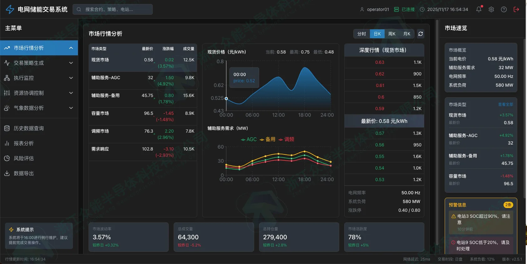 《电网侧储能智慧运营系统》以“运营+交易”一体化为核心,深度融合虚拟电厂(VPP)功能,打通从设备监控、状态诊断到市场申报、结算分析的全链条。系统采用强化学习算法,能够基于历史数据和实时市场信号自主迭代报价策略,在日前、日内、实时等多个时间尺度上实现动态优化。在扬州某实际项目中,该系统上线后单日综合收益提升超过78%,验证了其在复杂调度环境下的适应性与经济性。