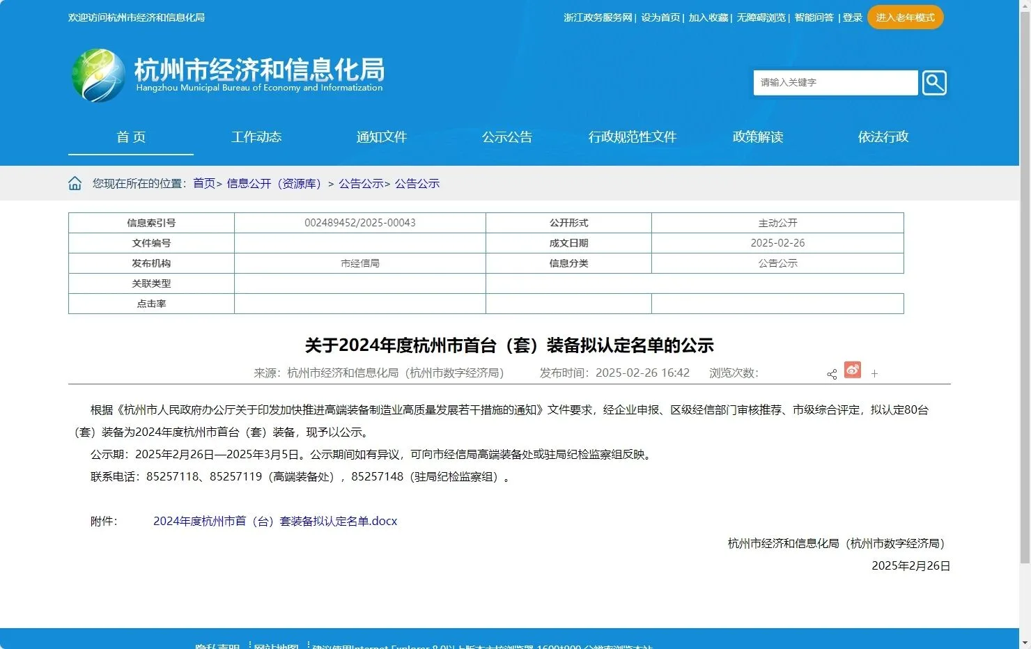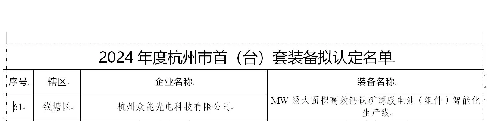 近日,杭州众能光电科技有限公司自主研发的“MW级大面积高效钙钛矿薄膜电池(组件)智能化生产线”成功入选2024年度杭州市首台(套)装备名录。
