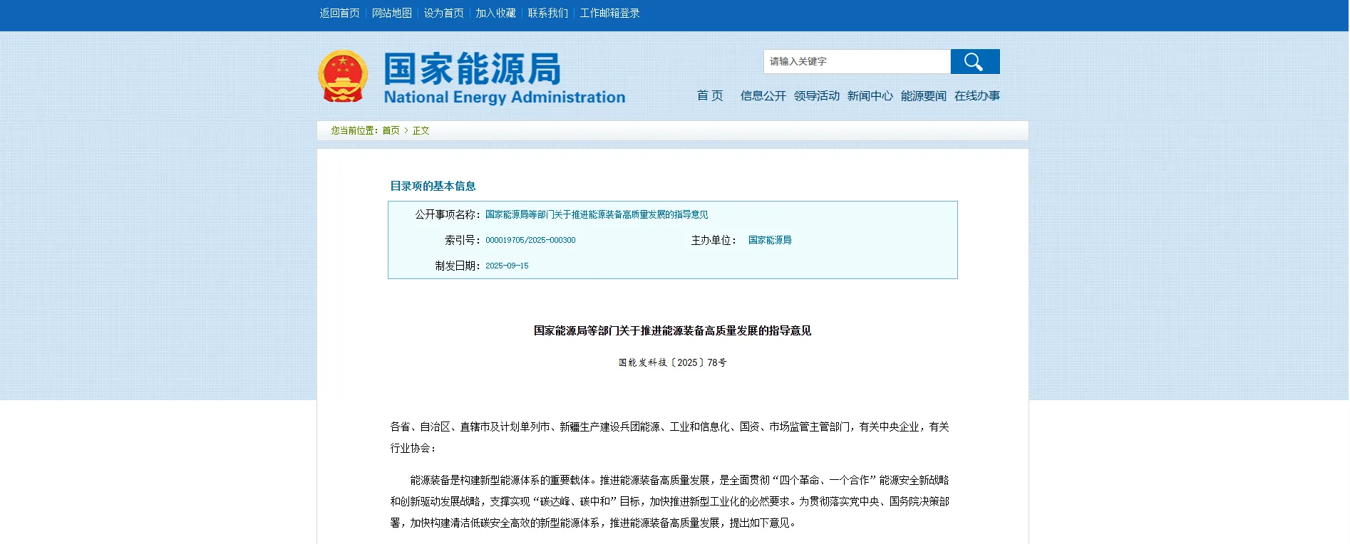 近日,国家能源局联合工信部、国资委、市场监管总局印发《关于推进能源装备高质量发展的指导意见》(国能发科技〔2025〕78 号)